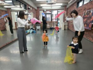 3歳児クラスは、スカーフでいろんな動きを考えてフレーズの聴き分けもできるようになります。